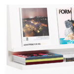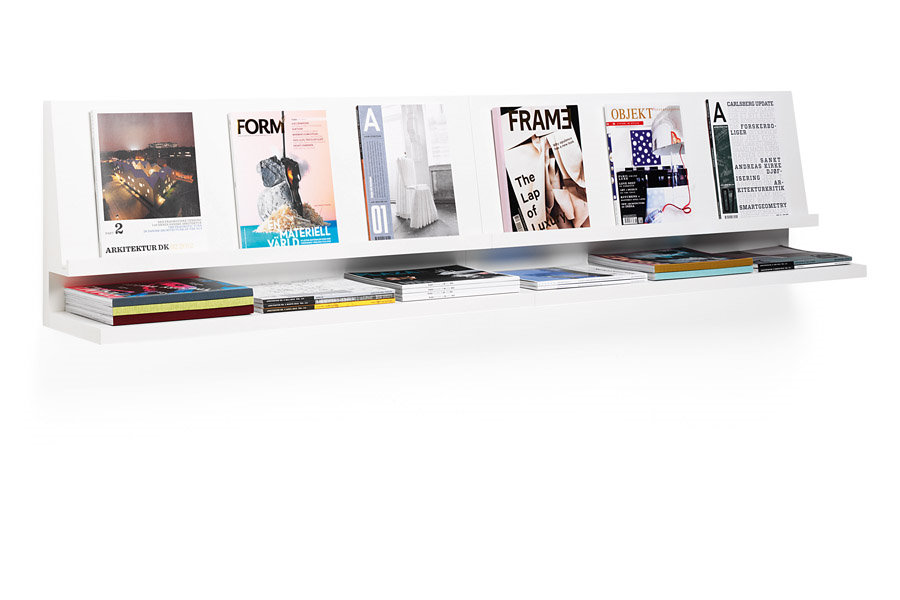 I noticed at many workspaces and waiting rooms that magazines are difficult keep in order. At places where media is of great importance, it can be annoying not to be able to find last months issue. Traditional magazine racks are designed to show the media you want to show, but leave no space for precious back copies. Expo, produced and sold by MATERIA, is a media storage that combines a display with a shelf. The latest editions are shown on the display with older editions on the shelf underneath. The design is plain white and has straight lines. Mounted on a white wall it can easily look as if it was custom made for the interior. Several Expos next to each other and above each other give an impressive impact to the room and carry lots of media.