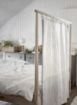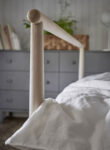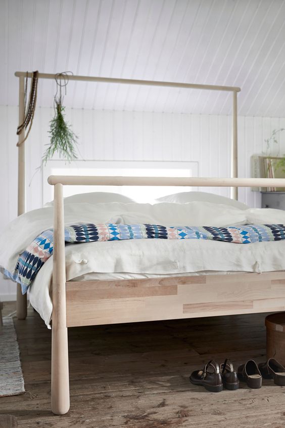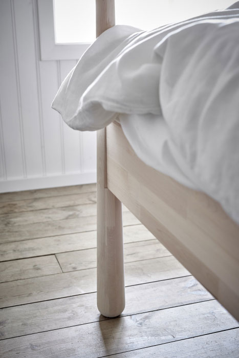 The initial idea behind this design was to allow the user to use fabrics or blankets as a head board. The high bar at the head of the bed would make it easy to hang and change the fabrics or blankets. In my opinion, this would perfectly answer to the need for personalization which is common in the new era of home styling. Whilst working on the design, I soon realized that the bar would also be perfect for hanging clothes hangers. This resulted in the bed being headboard, wardrobe and room divider in one. Together with the IKEA team we decided to produce the bed in untreated wood. The buyer can choose whether to paint, stain, or wax the wood offering another possibility for creative minded people.