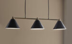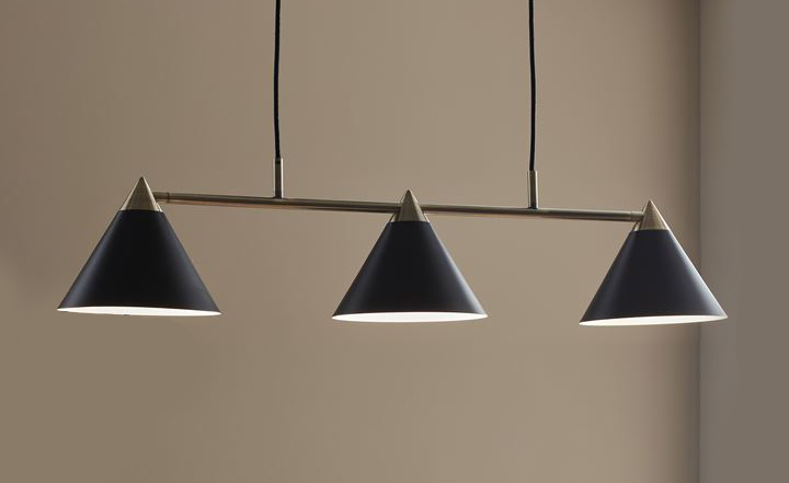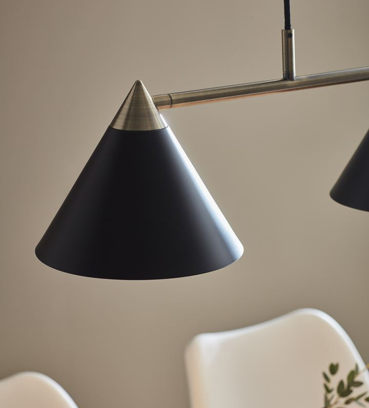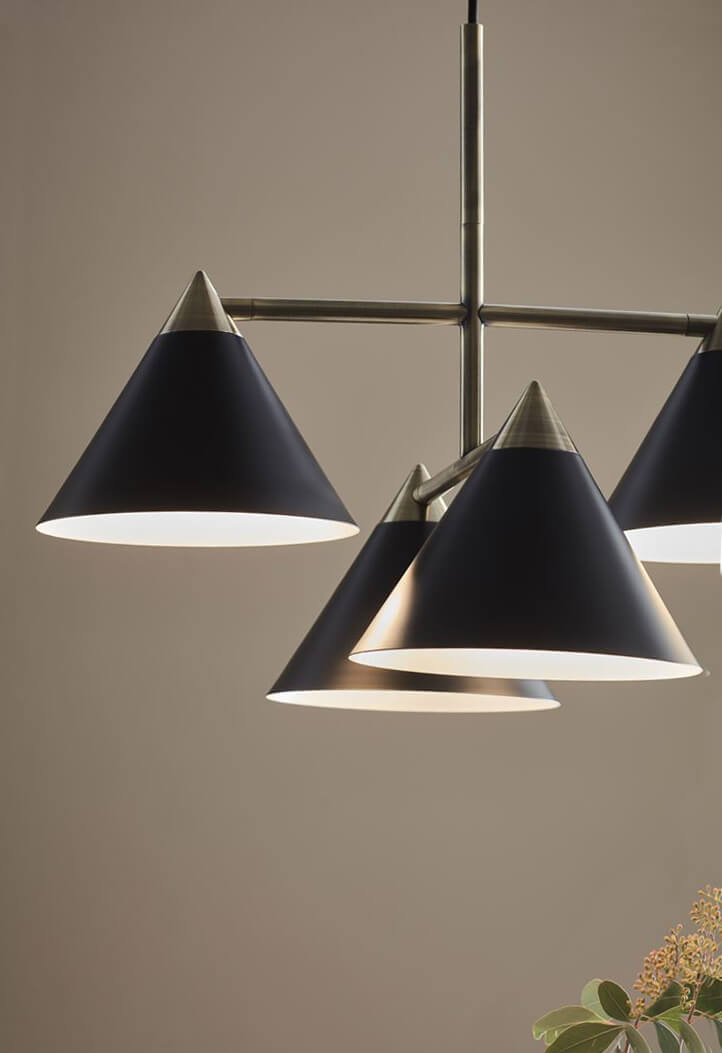 Klint ceiling lamp features four ‘cone shaped’ lampshades in two levels with the option of shedding light upwards or downwards.