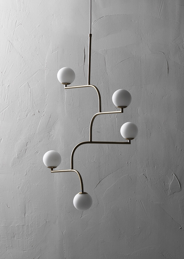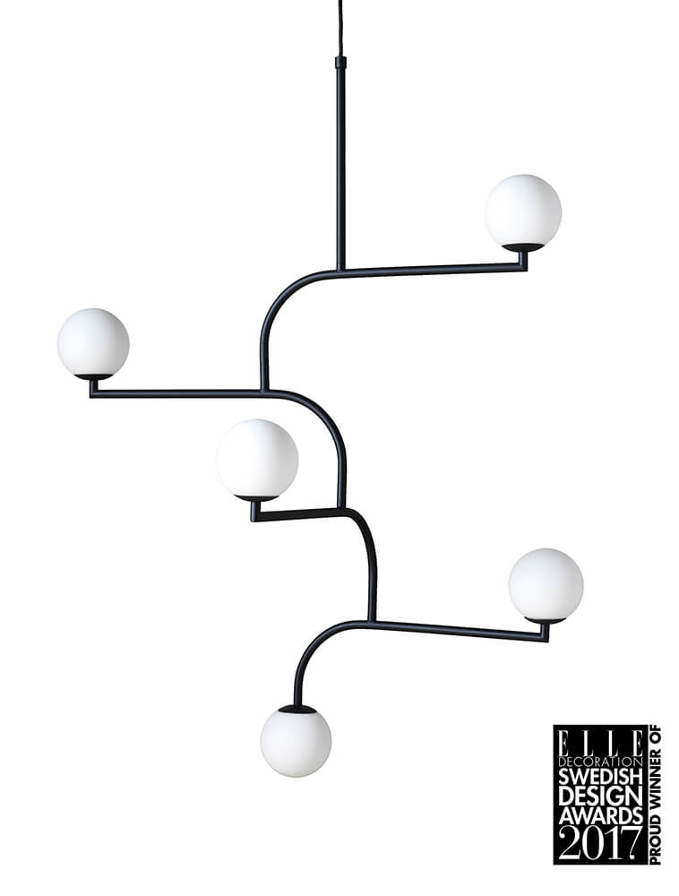 Mobil designed for Pholc. Mobil 100 is made up of five luminaires that are linked to each other. Inspired by the black steel racks on the balconies of New York townhouses, and the round streetlights on Brooklyn bridge, I came up with this pendant that resembles a mobile. Thanks to its design, it looks good from all angles, making it versatile and useful in all rooms. Available in three colours.