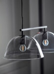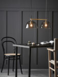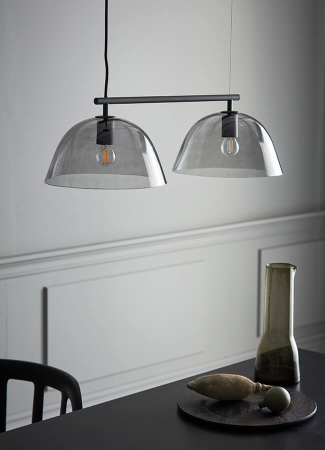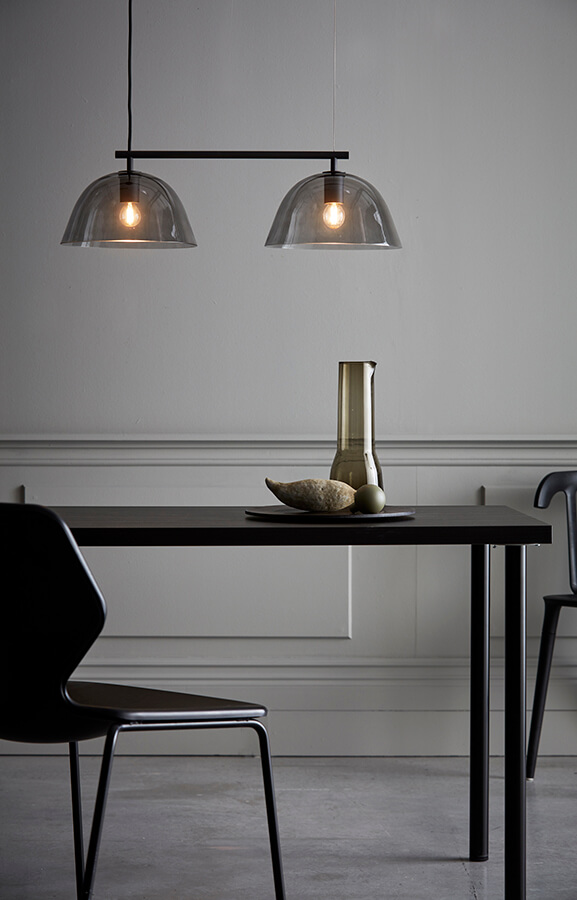 The Wendo 70 ceiling lamp for Care of Bankeryd is an elegant light with two semi-transparent glass domes of smoke-coloured glass. Each dome is held firmly in place with a solid metal arm to give the piece a modern and gently industrial aesthetic. Position the ceiling light above your dining table or kitchen island as a luxurious accent in the space!